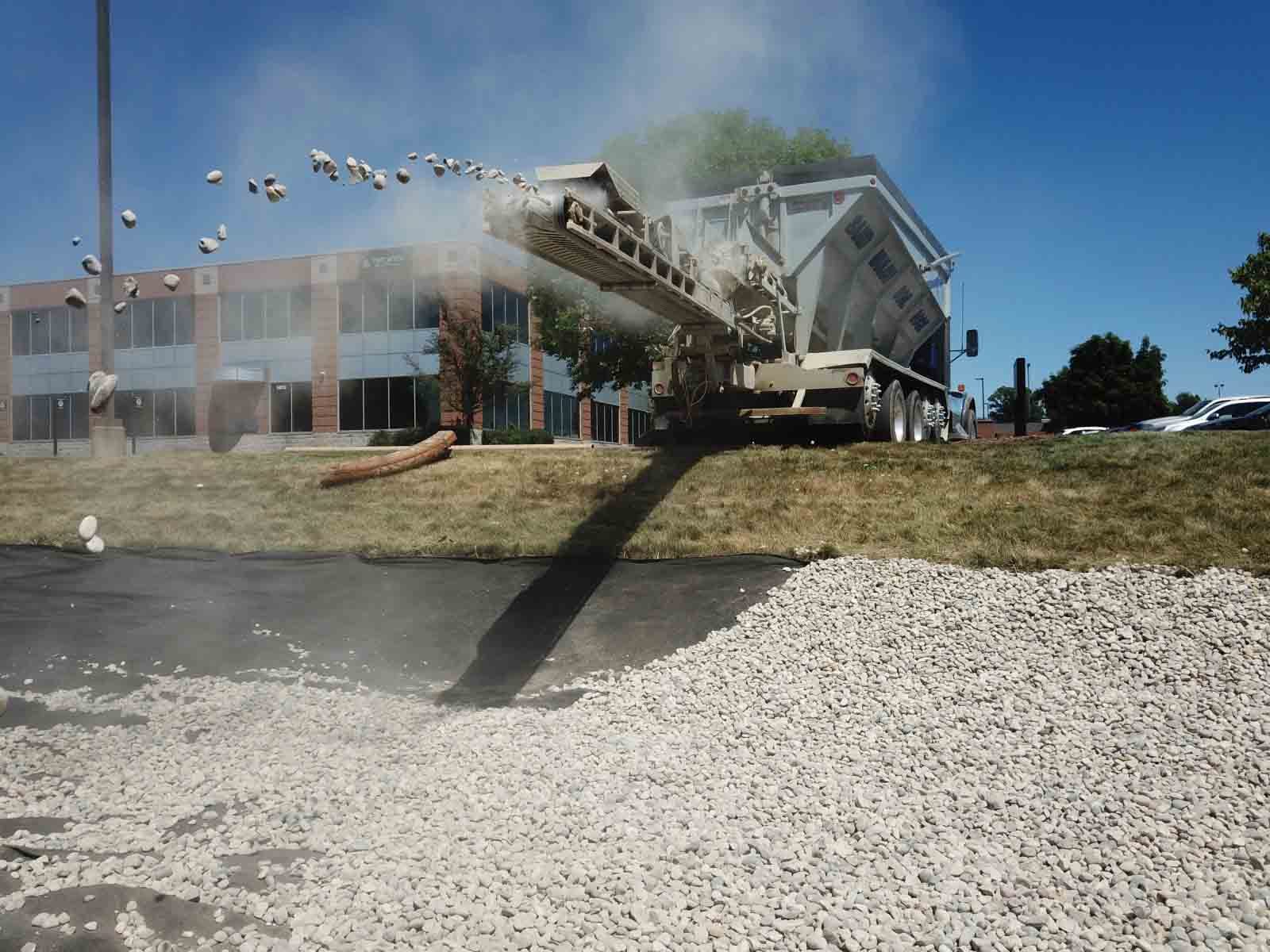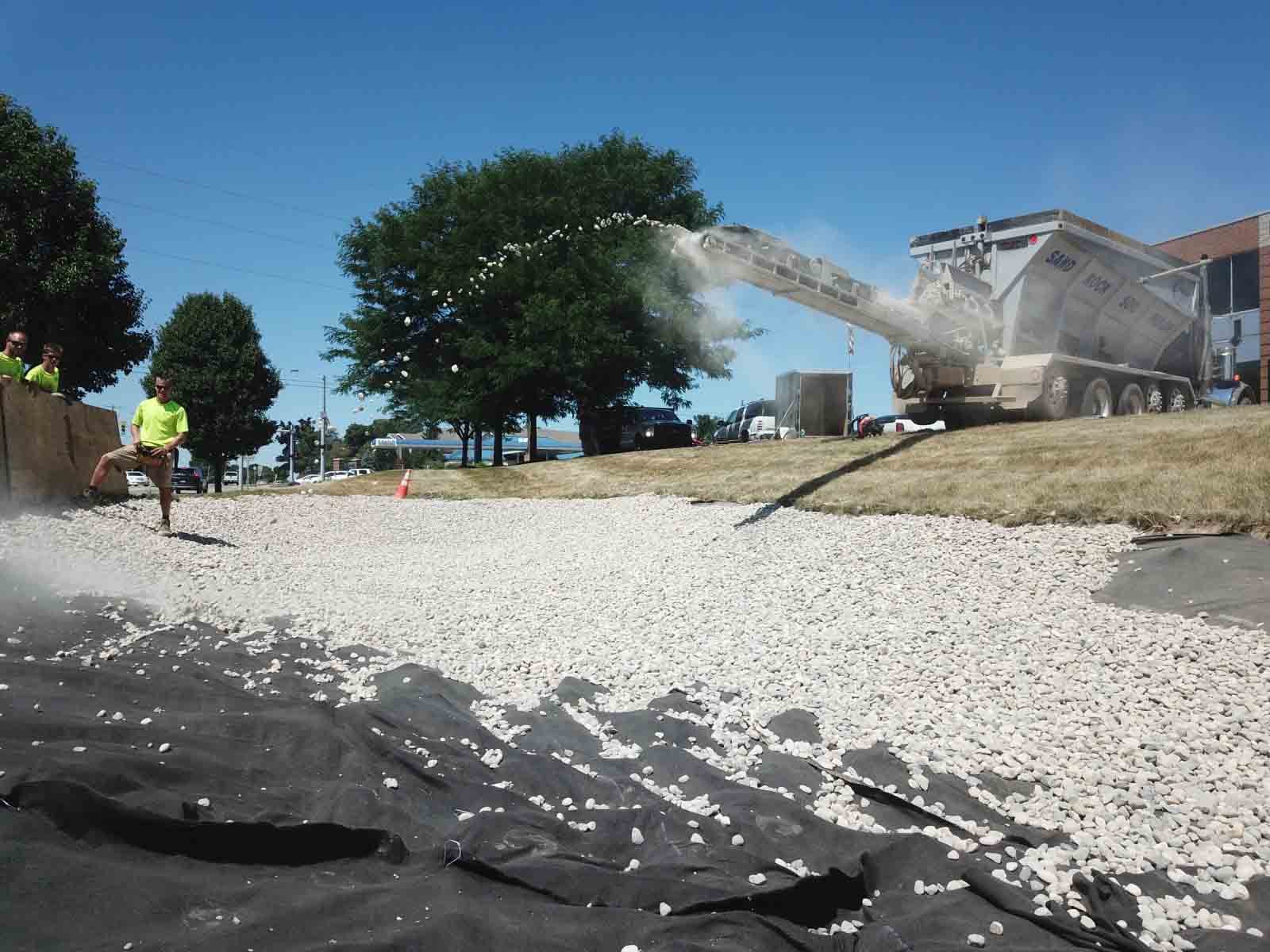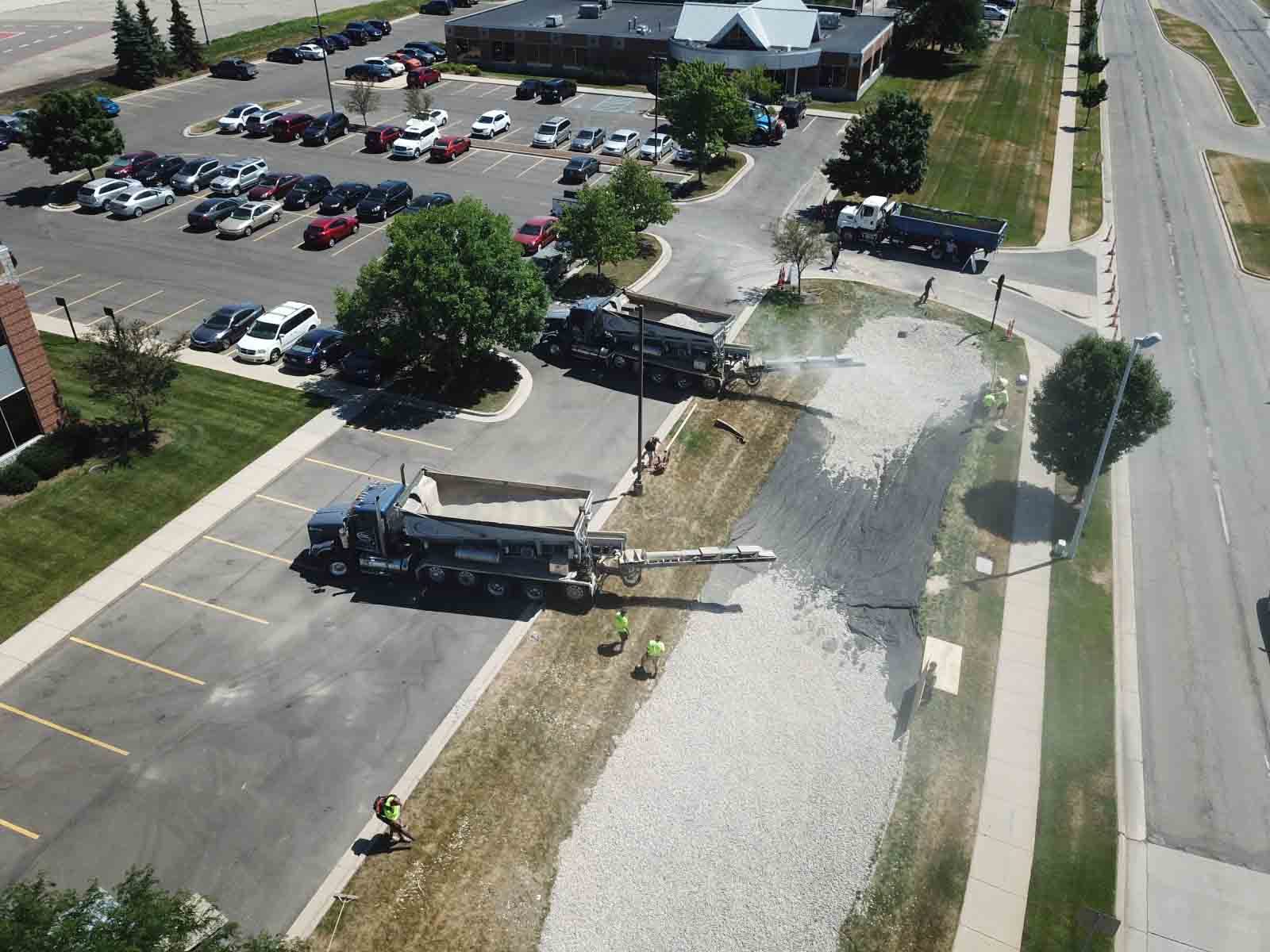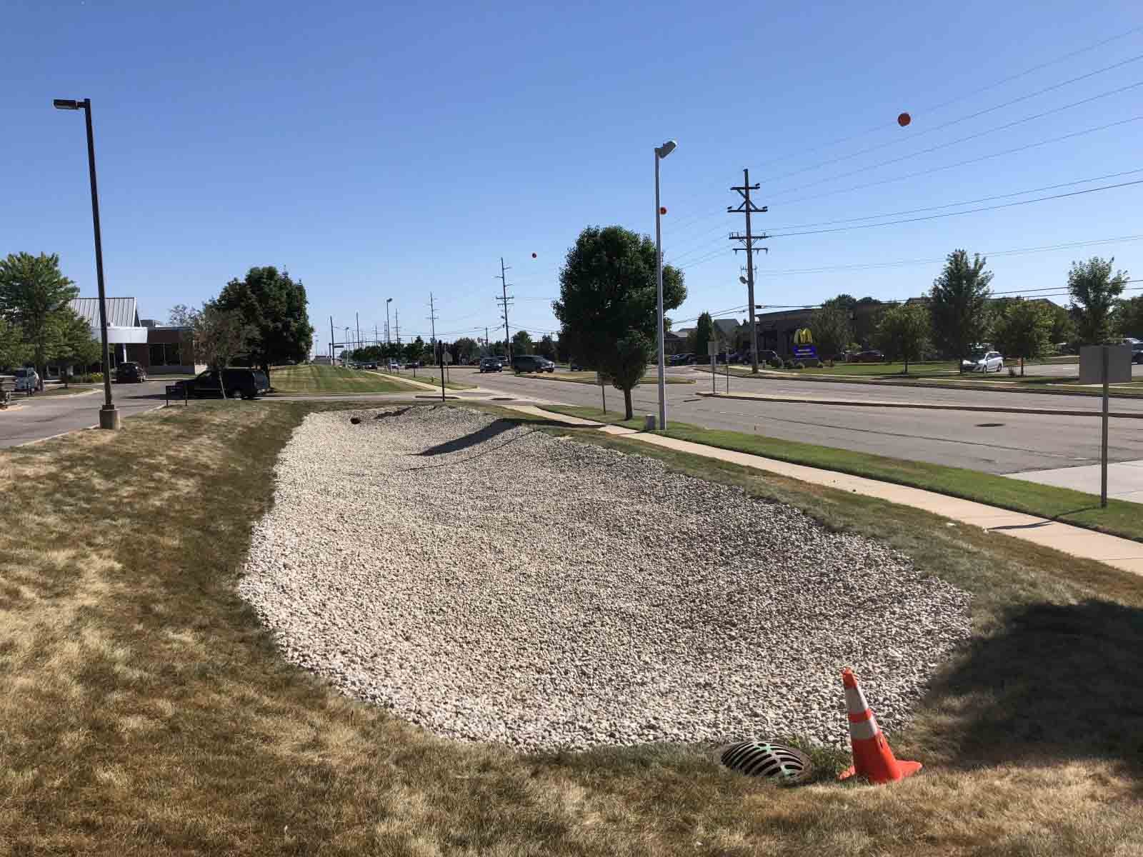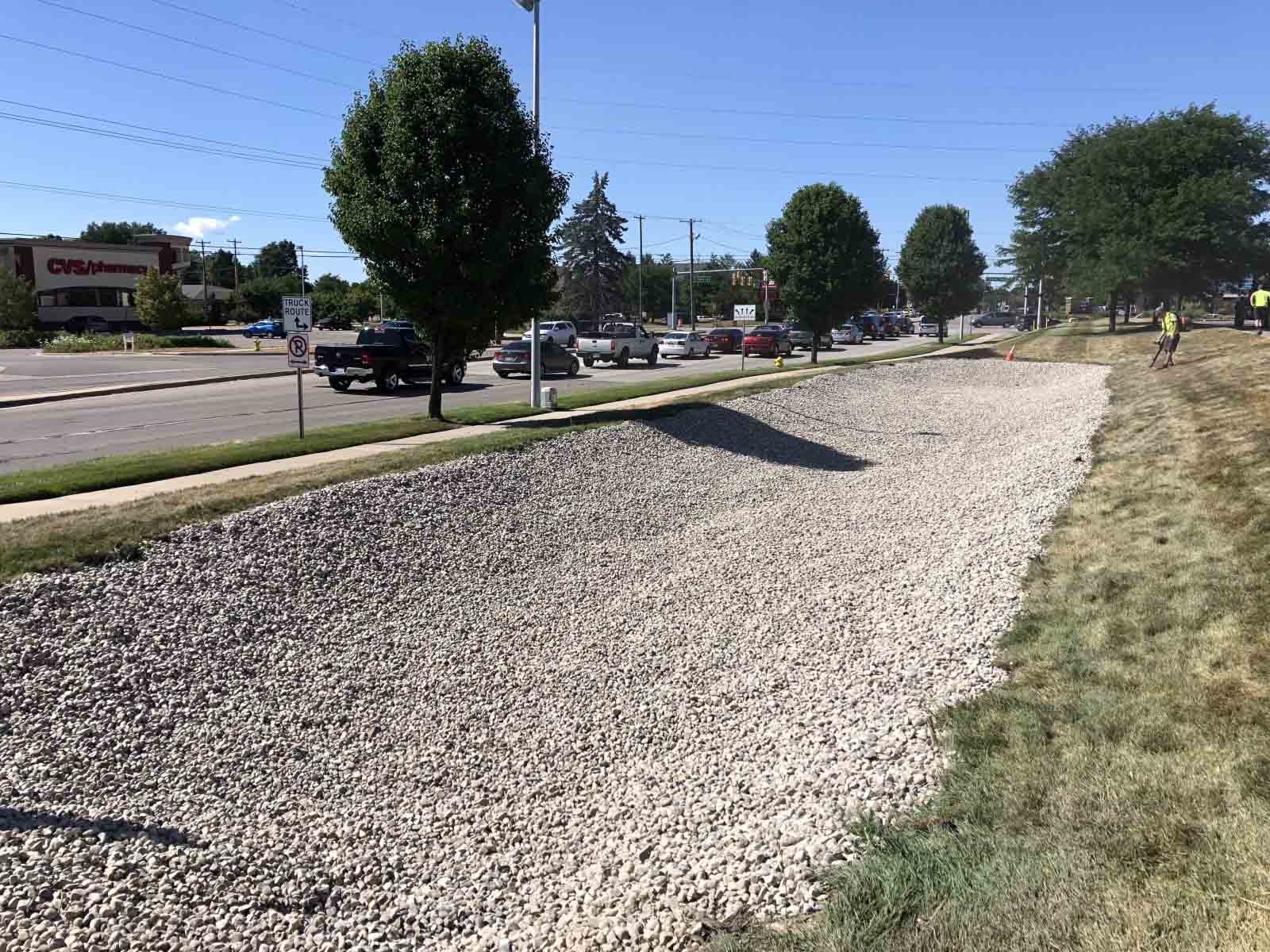Mercantile Bank had issues with clogged drainage pipes in a roadside retention pond. This resulted in major water backup on their property. A local industrial contractor cleared the obstructions and restored proper drainage. Superior Groundcover, Inc supplied two stone slingers to install 1″ – 2″ washed stone as the new base for the retention pond.